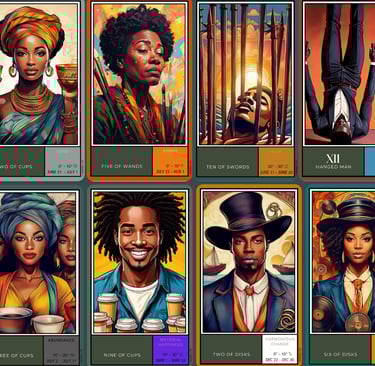 Select your deck: Rider Waite with Keywords or the intricate Black Empowerment Tarot of Thoth.